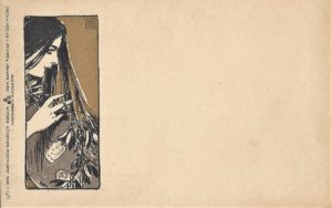 From its inception, the Siebener Club had already established a tradition of corresponding with each other using hand-drawn postcards in pen and ink and colour washes. Early in 1895, these cards got the attention the attention of Philipp & Kramer who chose 50 out of a supposed 1000 original artist designs for their Series I-V. Released in December 1897, the designs featured decorative Jugendstil borders and stylized images of women, foreshadowing some of graphic elements that Moser and Hoffmann would further develop in the Vienna Secession’s graphic journal Ver Sacrum, as well as the Secession’s own promotional postcards. To mark the Paris Exposition Universelle in 1900, Philipp & Kramer also printed a special series known as the ‘Zudruck Paris Edition’ (Overprint Paris edition), which featured a note by the publishers on the front offering free samples and a list of the first 52 series on the back.