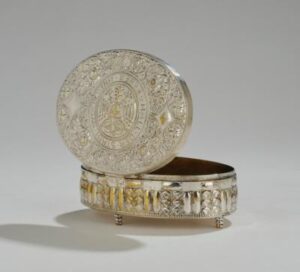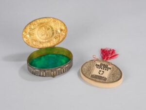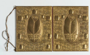 Remigius Geyling’s Ballspende for the 1909 featured an illustrated book and carrying box, which exemplified the Weiner Werkstätte style of his postcard designs. In turn, his Ballspende design for the 1911 Ball der Stadt featured a silver carrying case that opened to reveal a small booklet.